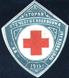 1915 г. Виньетка в виде щитка сложной формы разм. 42 х 55 мм. Двухцветная печать на белой бумаге. В центре в круглой рамке диаметром 26 мм красный крест. По периметру наружной рамки текст: «Вторая отечественная война. 1915 г. На противогазы».