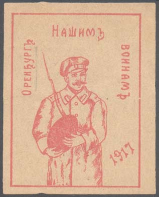 1917 г. Разм. 51 х 64 мм. Одноцветная печать на желто-серой бумаге. В центре в прямоугольной рамке разм. 44 х 58 мм солдат с подарком в руках. По внутреннему периметру рамки текст: «Оренбург Нашим воинам 1917».