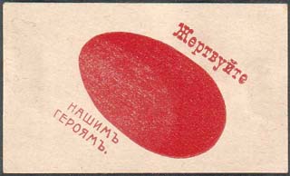 1915(?) г. Разм. 32 х 53 мм. Одноцветная печать на белой бумаге. Пасхальное яйцо. Текст: «Жертвуйте нашим героям».