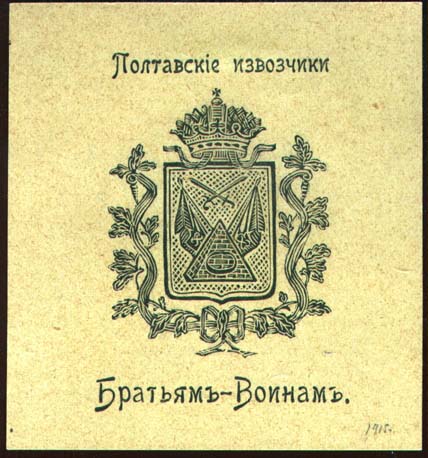 1916 г. Разм. 69 х 76 мм. Одноцветная печать на бумаге различных цветов. В центре герб Полтавы. Текст: «Полтавские извозчики Братьям-Воинам».