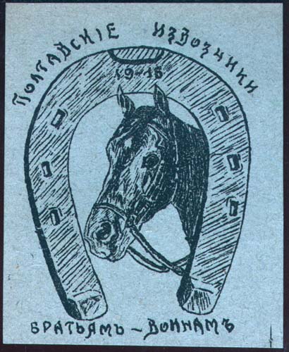1916 г. Разм. 46 х 58 мм. Одноцветная печать на бумаге различных цветов. Голова лошади внутри подковы. На подкове дата: «1916». Сверху текст: «Полтавские извозчики». Внизу продолжение текста: «Братьям-воинам».
