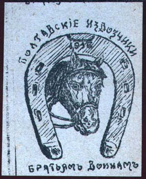 1916 г. Разм. 67 х 83 мм. Одноцветная печать на бумаге различных цветов. Голова лошади внутри под-ковы. На подкове дата: «1916». Сверху текст: «Полтавские извозчики». Внизу продолжение текста: «Братьям-воинам».