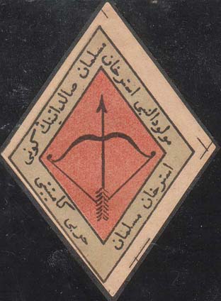 1917 г. Ромб разм. 52 х 70 мм. Трехцветная печать на кремовой бумаге. В центре в двойной рамке в форме ромба разм. 45 х 61 мм эмблема Мусульманского военного комитета: натянутый лук со стрелой. По периметру между рамками тест на татарском языке арабским шрифтом.