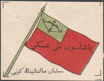 1917 г. Разм. 60 х 45 мм. Трехцветная печать на кремовой бумаге. В центре красный флаг. В левом верхнем углу полотнища флага на зеленом фоне натянутый лук со стрелой. В центре полотнища флага текст на татарском языке арабским шрифтом. Внизу текст на татарском языке арабским шрифтом. По углам знак…