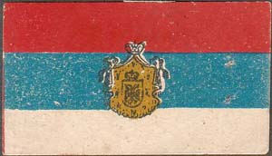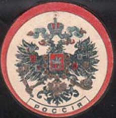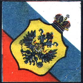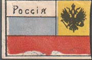 1915 г. Ромб разм. 65 х 65 мм. Многоцветная печать на белой бумаге. На фоне российского флага в цен-тре в фигурной рамке герб России. Сверху императорская корона.