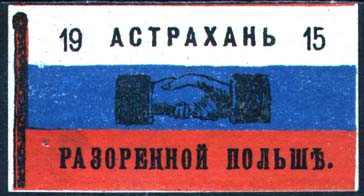 1915 г. Виньетка разм. 60 х 32 мм в виде российского флага с древком. Трехцветная печать на белой бумаге. В центре две руки, сцепленные в рукопожатии. Сверху текст: «19 Астрахань 15». Внизу продолжение текста: «Разоренной Польше».