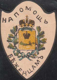 1915(?) г. Виньетка в форме фигурного щитка сложной формы разм. 37 х 53 мм. Многоцветная печать на серой бумаге. В центре герб Астраханской губернии. Сверху текст: «На помощь». Внизу продолжение текста: «Беженцам».
