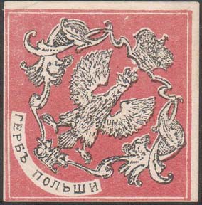 1915(?) г. Ромб разм. рамки 42 х 42 мм. Двухцветная печать на плотной сероватой бумаге. В рамке в форме ромба в центре на красном фоне герб Польши. Внизу полукругом текст: «Герб Польши».