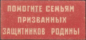 1915(?) г. Разм. 55 х 26 мм. Одноцветная печать на желтоватой бумаге. В центре на сплошном фоне текст в три строки: «Помогите семьям призванных защитников Родины».