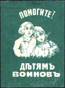 1915(?) г. Разм. 36 х 48 мм. Одноцветная печать на белой бумаге. В центре на сплошном фоне двое детей. Сверху текст: «Помогите!». Внизу продолжение текста в две строки: «Детям воинов».
