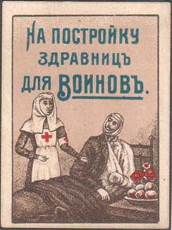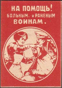 1917 г. 29.10.1917 г. Разм. 35 х 49 мм. Одноцветная печать на белой бумаге. В центре в круглой рамке диаметром 32 мм сестра милосердия и двое раненых. Сверху на сплошном фоне текст в три строки: «На помощь! Больным и раненым воинам».