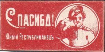 1917 г. Разм. 56 х 27 мм. Одноцветная печать на белой бумаге. Справа в круглой рамке солдат. Слева на сплошном фоне текст в две строки: «Спасибо! Юный Республиканец».