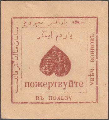 1918 г. 17.-31.03.1918 г. Разм. рамки 47 х 47 мм. Одноцветная печать на тонкой желто-серой бумаге. В двойной прямоугольной рамке в центре сердце(?). По периметру текст на русском и татарском языках: «Пожертвуйте в пользу увеч[ных]. воинов».