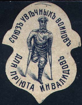 1916(?) г. Виньетка в виде фигурного щитка сложной формы разм. 46 х 60 мм. Одноцветная печать на се-роватой бумаге. В центре инвалид на костылях. Сверху текст: «Союз увечных воинов». Внизу текст: «Для приюта инвалидов».
