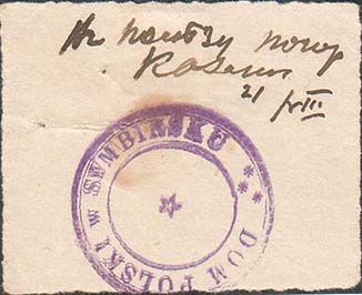 1917(?) г. Разм. 55 х 45 мм. Одноцветная печать на белой бумаге. В центре синий оттиск круглой печати общества диаметром 31 мм. В центре печати пятиконечная звезда. По окружности текст на польском языке: «Дом польский в Симбирске». Сбор в пользу погорельцев Казани.
