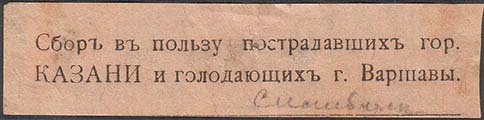 1917(?) г. Разм. 81 х 19 мм. Одноцветная печать на тонкой желтоватой бумаге. В центре текст в две строки: «Сбор в пользу пострадавших гор. Казани и голодающих г. Варшавы».