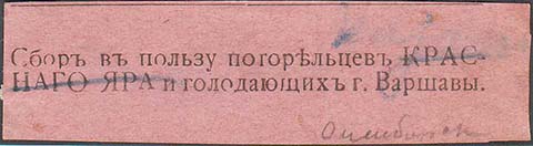 1917(?) г. Разм. 80 х 21 мм. Одноцветная печать на тонкой розово-серой бумаге. В центре текст в две строки: «Сбор в пользу погорельцев Красного Яра и голодающих г. Варшавы».