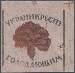 1922 г. 22.04.1922 г. Разм. 40 х 45 мм. Двухцветная печать на толстой серо-зеленой бумаге низкого качества. В центре различные рисунки. Сверху полукругом текст: «Украинкрест». Внизу полукругом продолжение текста: «Голодающим». Слева и справа вертикальные линии.