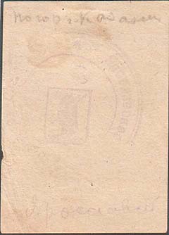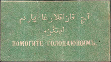 1915(?) г. Разм. 58 х 32 мм. Двухцветная печать на сероватой бумаге. На сплошном фоне в центре текст в две строки на местном языке арабским шрифтом. Внизу текст: «Помогите голодающим».