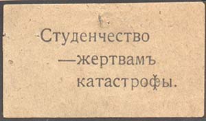 1912(?) г. Разм. 39 х 23 мм. Одноцветная печать на желтоватой бумаге. В центре текст в три строки: «Студенчество - жертвам катастрофы».