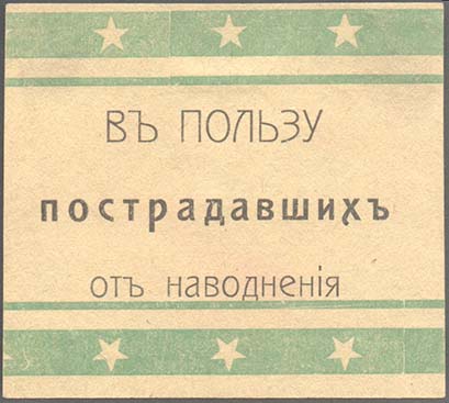 1912(?) г. Разм. 68 х 60 мм. Двухцветная печать на желтоватой бумаге. В центре текст в три строки: «В пользу пострадавших от наводнения». Сверху и снизу полоски с декоративными элементами в виде трех пятиконечных звездочек.