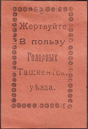 1917(?) г. Разм. 38 х 57 мм. Одноцветная печать на серо-оранжевой бумаге. В прямоугольной декоративной рамке разм. 27 х 45 мм текст в пять строк: «Жертвуйте в пользу Голодных Ташкентск[ого]. уезда».