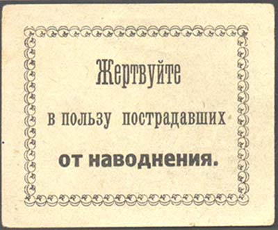 1918 г. Разм. 55 х 45 мм. Одноцветная печать на бумаге различных цветов. В центре в прямоугольной декоративной рамке разм. 45 х 36 мм. из растительного орнамента текст в три строки: «Жертвуйте в пользу пострадавших от наводнения».