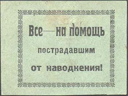 1917 г. Разм. 56 х 45 мм. Одноцветная печать на бумаге различных цветов. В центре в прямоугольной декоративной рамке разм. 45 х 36 мм. из растительного орнамента текст в три строки: «Все на помощь пострадавшим от наводнения».