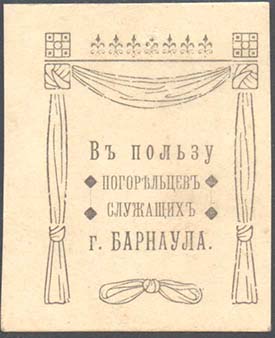 1917 г. Разм. 45 х 55 мм. Одноцветная печать на толстой кремовой бумаге. В центре в орнаментальной рамке сложной формы текст в четыре строки: «В пользу погорельцев служащих г. Барнаула».