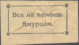 1918(?) г. Разм. 47 х 27 мм. Одноцветная печать на кремовой бумаге. В центре в прямоугольной рамке разм. 34 х 16 мм с кружками по углам текст в две строки: «Все на помощь Амурцам».