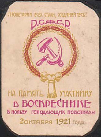 1921 г. 02.09.1921 г. Разм. 53 х 75 мм. Двухцветная печать на толстой белой глянцевой бумаге. В центре серп и молот в обрамлении венка из колосьев. Сверху текст в две строки: «Пролетарии всех стран соединяйтесь! Р.С.Ф.С.Р.». Внизу текст в че-тыре строки: «На память участнику в воскреснике в пользу…