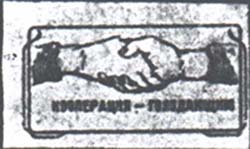 1922(?) г. Разм. 42 х 26 мм. Одноцветная печать на плотной кремовой бумаге. В прямоугольной фигурной рамке две руки в рукопожатии. Внизу текст: «Кооперация-голодающим».