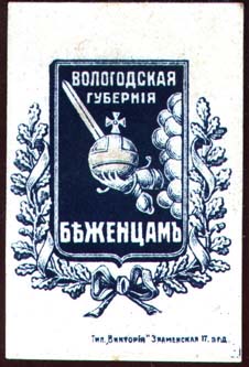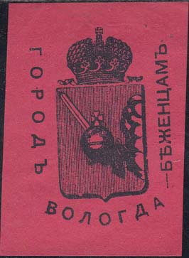 1915(?) г. Разм. 36 х 55 мм. Одноцветная печать на толстой желтоватой бумаге с мелованным верхним слоем. В центре герб Вологодской губернии. На щите герба текст в три строки: «Вологодская губерния беженцам». Справа внизу мелким шрифтом выходные данные: «Тип. «Виктория», Знаменская 17, ПГ-Д».