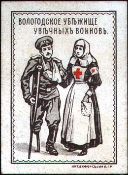1915(?) г. Разм. рамки 36 х 52 мм. Двухцветная печать на толстой желтоватой бумаге с мелованным верхним слоем. В двойной прямоугольной рамке в центре сестра милосердия ведет под руку инвалида. Сверху текст в две строки: «Вологодское убежище увечных воинов». Справа внизу под рамкой выходные данные…