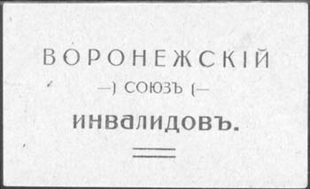 1917 г. Разм. 62 х 38 мм. Одноцветная печать на бумаге разных цветов. В центре текст в три строки: «Воронежский союз инвалидов». Внизу декоративный элемент в виде двух горизонтальных штрихов.