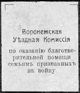 1917 г. 02.06.1917 г. Разм. 45 х 52 мм. Одноцветная печать на бумаге различных цветов и толщины. В центре текст в шесть строк: «Воронежская Уездная Комиссия по оказанию благотворительной помощи семьям призванных на войну». По углам знака разграничительные линии.