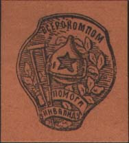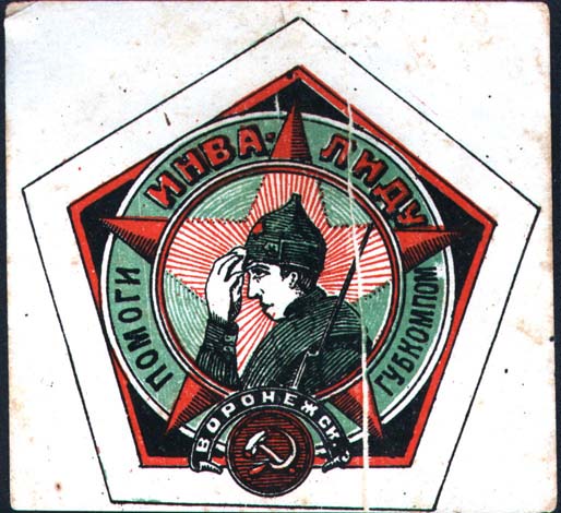 1923(?) г. Разм. 85 х 80 мм. Трехцветная печать на белой бумаге. В двойной пятиугольной рамке в центре дополнительная двойная круглая рамка. В круг-лой рамке в центре раненый красноармеец на фоне пятиконечной звезды. По окружности между круглыми рамками текст: «Помоги инвалиду. Воронежск[ий]. ГУБ…