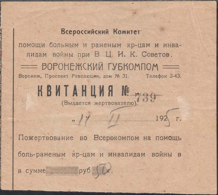 1925 г. 11.02.1925 г. Листок из квитанционной книжки разм. 121 х 105 мм. Одноцветная печать на сероватой бумаге. Левосторонняя нерегулярная зубц. В центре текст в одиннадцать строк: «Всероссийский Комитет помощи больным и раненым кр[асноармей]-цам и инвалидам войны при В.Ц.И.К. Советов. Воронежс…