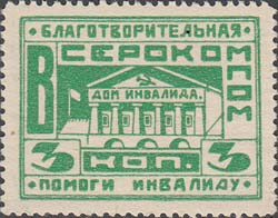 1925(?) г. Разм. рамки 36 х 27,5 мм. Двухцветная двухсторонняя печать на белой (оттенки) бумаге. Зубц. 11 1/2 низкого качества. С клеем. В прямоугольной рамке в центре изображение здания с текстом на фасаде: «Дом инвалида». По внутреннему периметру рамки текст: «Благотворительная. ВСЕРОКОМПОМ ...…