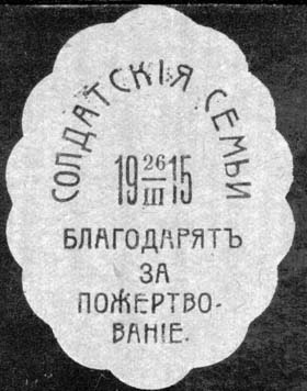 1915 г. 26.03.1915 г. Виньетка овальной формы разм. ≈ 44 х 58 мм с волнистыми краями. Одноцветная печать на бу-маге различных цветов с лаковым покрытием на лицевой стороне. В центре дата: «26/III 1915». Сверху полукругом текст: «Солдатские семьи». Внизу продолжение текста в четыре строки: «Благода…