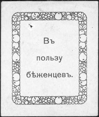 1915(?) г. Разм. 52 х 62 мм. Одноцветная печать на сероватой бумаге. В двойной декоративной рамке разм. ≈ 40,5 х 44,5 мм с растительным орна-ментом текст в три строки: «В пользу беженцев».