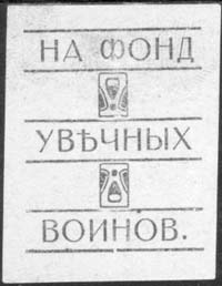 1915(?) г. Разм. 35 х 42 мм. Одноцветная печать на бумаге различных цветов. В центре текст в три строки: «На фонд увечных воинов». Между строками текста декоративные элементы.