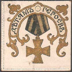 1915(?) г. Разм. 41 х 41 мм. Двухцветная печать на плотной белой бумаге. В центре Георгиевский крест на колодке. Сверху в декоративной рамке с орнаментом полукругом текст: «Детям героев».