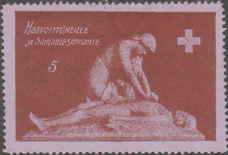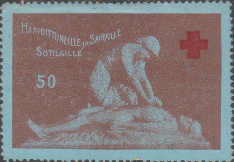 1916 г. Разм. 54 х 34 мм. Двухцветная печать на плотной желтоватой бумаге со сплошным цветным фоном различных цветов. Зубц. 11 1/2. В центре аллегорический сюжет. В правом верхнем углу красный крест. Слева сверху текст в две строки на финском языке: «В пользу больных и раненых воинов» и номинал.