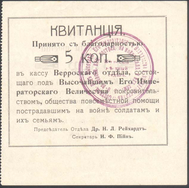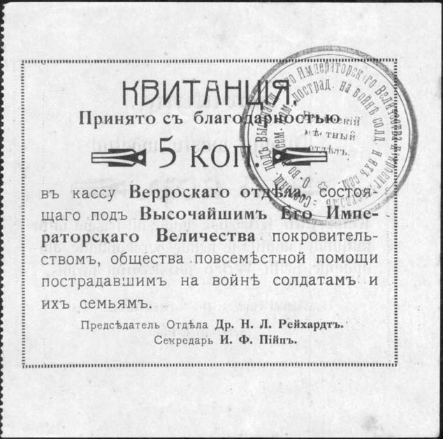 1914(?) г. Листок из квитанционной книжки. Одноцветная двухсторонняя печать на тонкой белой бумаге. Левосторонняя зубц. 11 1/2. На лицевой стороне в прямоугольной рамке разм. 90 х 74 мм в центре текст в девять строк: «Квитанция. Принято с благодарностью ... коп. в кассу Верроского отдела, состоящ…
