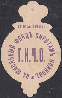 1916 г. 11.05.1916 г. Виньетка в форме овала разм. 34 х 42 мм с фигурными краями. Одноцветная печать на толстой белой бумаге. В центре аббревиатура «Г.И.Ч.О.». По окружности текст: «На школьный фонд сиротам воинов». Сверху дата: «11 мая 1916 г.».