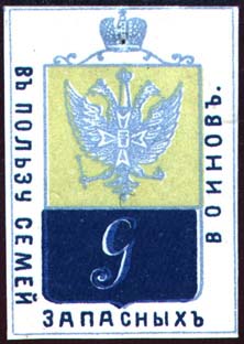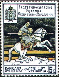 1914 г. Разм. 30 х 40,5 мм. Многоцветная печать на белой бумаге. Зубц. 11 1/2. С клеем. В центре воин с копьем и щитом на коне. Сверху герб города и текст в три строки: «Екатеринославское Городское Общественное Управление». Внизу текст: «Воинам и их семьям».