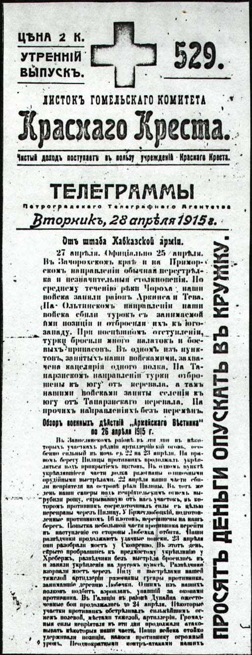 1915 г. 28.04.1915 г. Листок разм. 179 х 444 мм. Двухцветная двухсторонняя печать на тонкой сероватой бумаге. На лицевой стороне текст в девять строк: «Цена 2 к. Утренний выпуск. 529. Листок Гомельского Комитета Красного Креста. ТЕЛЕГРАММЫ Петроградского Телеграфного Агентства. Вторник, 28 апреля …