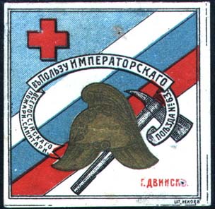 1915(?) г. Разм. рамки 46 х 45 мм. Многоцветная печать на белой бумаге. В двойной прямоугольной рамке в центре на фоне диагональной ленты цветов российского флага каска пожарного и топорик. По окружности на ленте текст: «В пользу Императорского Всероссийского Пожарн[ого]. Санитарн[ого]. Поезда №6…