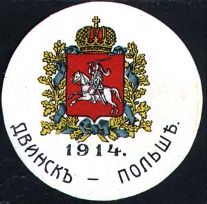 1914 г. Круг диаметром 48 мм. Многоцветная печать на желтоватой бумаге с мелованным верхним слоем. В центре герб Витебской губернии, ниже дата: «1914.». Внизу полукругом текст: «Двинск - Польше».